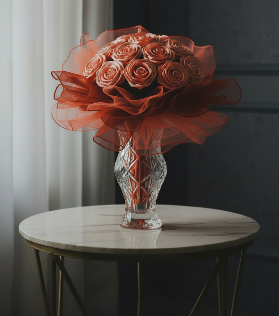 Tato kytice v sobě nese nespoutanost života. Ručně vytvořená z atlasových stuh a jemné organzy, působí živě, ale nikdy nezvadne. Kytice se skládá z 11 květů - 7 rozkvetlých a 4 poupat, doplněných o tři vrstvy organzy ve tvaru bohaté kaskády. Její průměr je přibližně 50 - 60 cm, výška 40 cm. Uvnitř kytice se nacházejí jemná světýlka, která po rozsvícení vytvářejí teplé a útulné světlo. Pro ještě příjemnější atmosféru jsou do kytice vloženy papírky s jemným esenciálním olejem, který kytici dodá lehkou vůni a pocit domova. Je to kytice, která potěší, rozzáří i provoní každý prostor - ideální jako dárek pro radost, dekorace, nebo symbol osobního okamžiku. Pouze jeden kus. Vše je originál.
