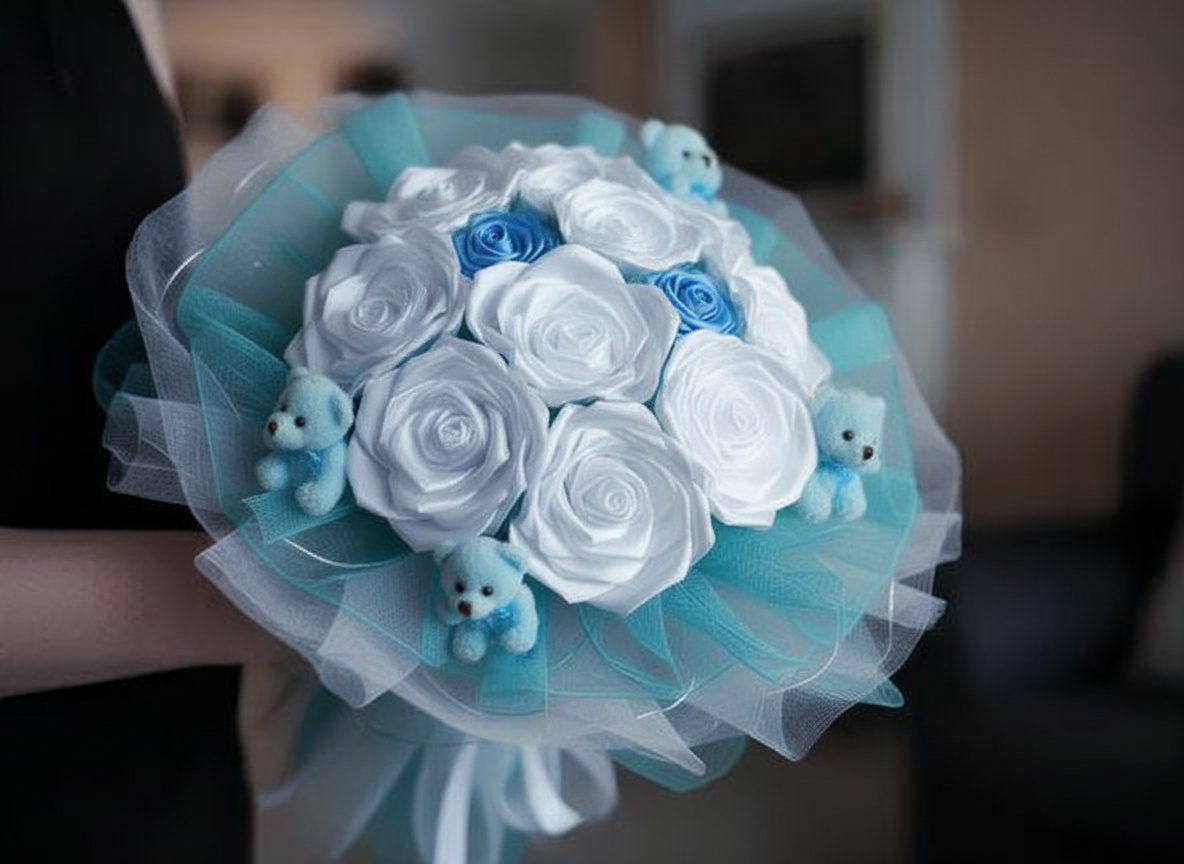 Tato kytice v sobě nese nespoutanost života. Ručně vytvořená z atlasových stuh a jemné organzy, působí živě, ale nikdy nezvadne. Kytice se skládá z 11 květů - 7 rozkvetlých a 4 poupat, doplněných o tři vrstvy organzy ve tvaru bohaté kaskády a malinkých medvídků. Její průměr je přibližně 50 - 60 cm, výška 40 cm.  Je to kytice, která potěší každou maminku, je to symbol osobního okamžiku. Pouze jeden kus. Vše je originál.