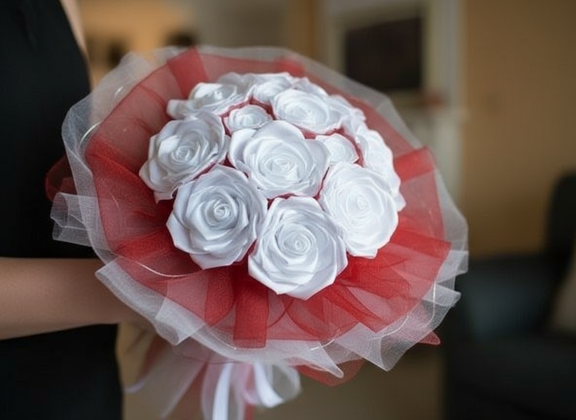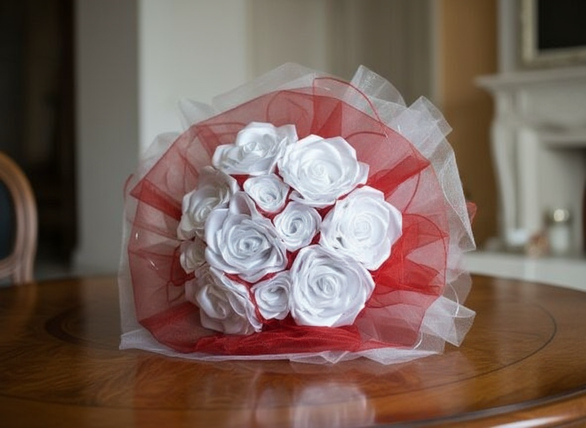 Tato kytice v sobě nese lásku a něhu. Ručně vytvořená z atlasových stuh a jemné organzy, působí živě, ale nikdy nezvadne. Kytice se skládá z 11 květů - 7 rozkvetlých a 4 poupat, doplněných o tři vrstvy organzy ve tvaru bohaté kaskády. Její průměr je přibližně 50 - 60 cm, výška 30 - 40 cm. Uvnitř kytice se nacházejí jemná světýlka, která po rozsvícení vytvářejí teplé a útulné světlo. Pro ještě příjemnější atmosféru jsou do kytice vloženy papírky s jemným esenciálním olejem, který kytici dodá lehkou vůni a pocit domova.Je to kytice, která potěší, rozzáří i provoní každý prostor - ideální jako dárek pro radost, dekorace, nebo symbol osobního okamžiku. Pouze jeden kus. Vše je originál.