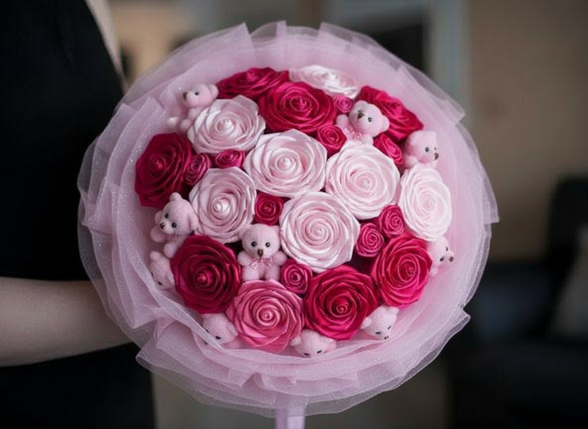 Tato kytice v sobě nese nespoutanost života. Ručně vytvořená z atlasových stuh a jemné organzy, působí živě, ale nikdy nezvadne. Kytice se skládá z 29 květů - 15 rozkvetlých a 14 poupat, doplněných o tři vrstvy organzy ve tvaru bohaté kaskády a malinkých medvídků. Její průměr je přibližně 60 - 70 cm, výška 40 cm. Je to kytice, která potěší každou maminku, je to symbol osobního okamžiku. Pouze jeden kus. Vše je originál.