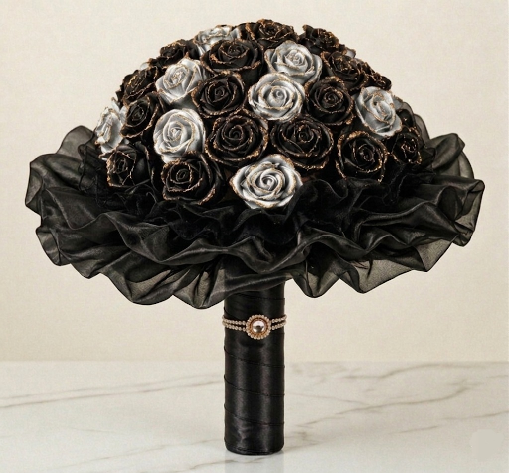 Tato kytice v sobě nese množství lásky a nezapomenutelných vzpomínek. Ručně vytvořená z atlasových stuh a jemné organzy. Kytice se skládá z 31 květů - 24 rozkvetlých a 7 poupat, doplněných o tři vrstvy organzy ve tvaru bohaté kaskády. Její průměr je přibližně 45 cm, výška 35 cm. Je to kytice, která mluví za vás. JEDINEČNÝ ORIGINÁL.