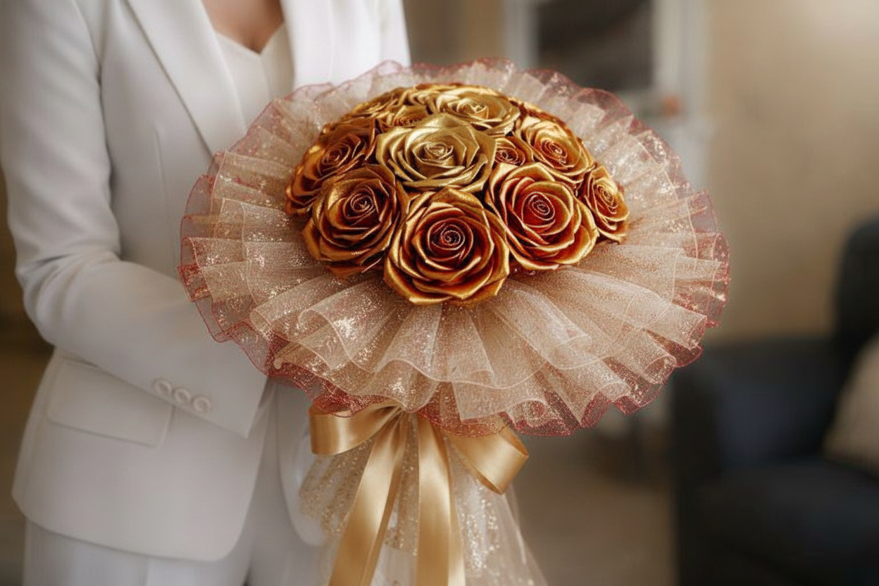 Tato kytice v sobě nese kouzlo okamžiku, který se nebude opakovat. Ručně vytvořená z extra širokých (5cm) atlasových stuh a jemné organzy, působí živě, ale nikdy nezvadne. Kytice se skládá z 11 květů - 7 rozkvetlých a 4 poupat, doplněných o tři vrstvy organzy ve tvaru bohaté kaskády. Její průměr je přibližně 60 cm, výška 40 cm. Tato svatební kytice nezvadne a zůstane krásná i po letech. Pouze jeden kus. Vše je originál.