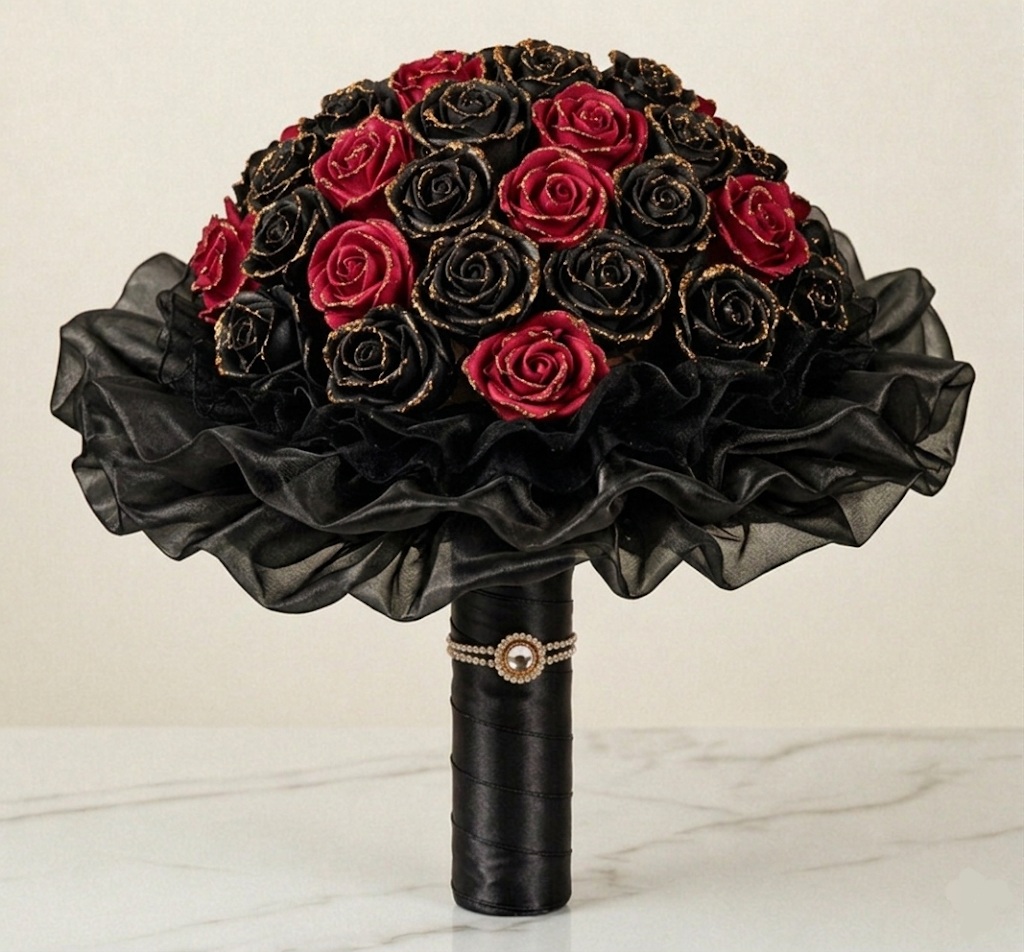 Tato kytice v sobě nese množství lásky a nezapomenutelných vzpomínek. Ručně vytvořená z atlasových stuh a jemné organzy. Kytice se skládá z 31 květů - 24 rozkvetlých a 7 poupat, doplněných o tři vrstvy organzy ve tvaru bohaté kaskády. Její průměr je přibližně 45 cm, výška 35 cm. Je to kytice, která mluví za vás. JEDINEČNÝ ORIGINÁL.