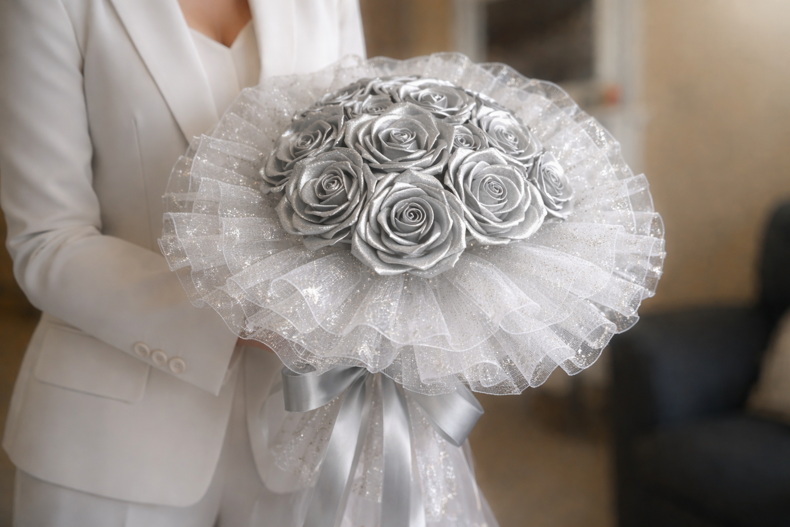 Tato kytice v sobě nese kouzlo okamžiku, který se nebude opakovat. Ručně vytvořená z extra širokých (5cm) atlasových stuh a jemné organzy, působí živě, ale nikdy nezvadne. Kytice se skládá z 11 květů - 7 rozkvetlých a 4 poupat, doplněných o tři vrstvy organzy ve tvaru bohaté kaskády. Její průměr je přibližně 60 cm, výška 40 cm. Tato svatební kytice nezvadne a zůstane krásná i po letech. Pouze jeden kus. Vše je originál.