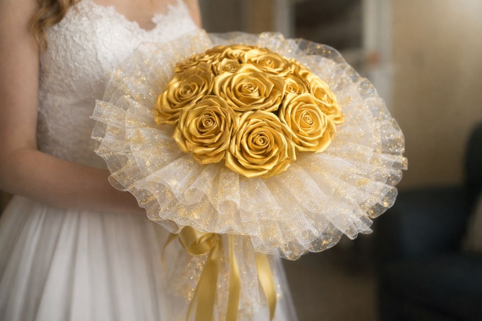 Tato kytice v sobě nese kouzlo okamžiku, který se nebude opakovat. Ručně vytvořená z extra širokých (5cm) atlasových stuh a jemné organzy, působí živě, ale nikdy nezvadne. Kytice se skládá z 11 květů - 7 rozkvetlých a 4 poupat, doplněných o tři vrstvy organzy ve tvaru bohaté kaskády. Její průměr je přibližně 60 cm, výška 40 cm. Tato svatební kytice nezvadne a zůstane krásná i po letech. Pouze jeden kus. Vše je originál.