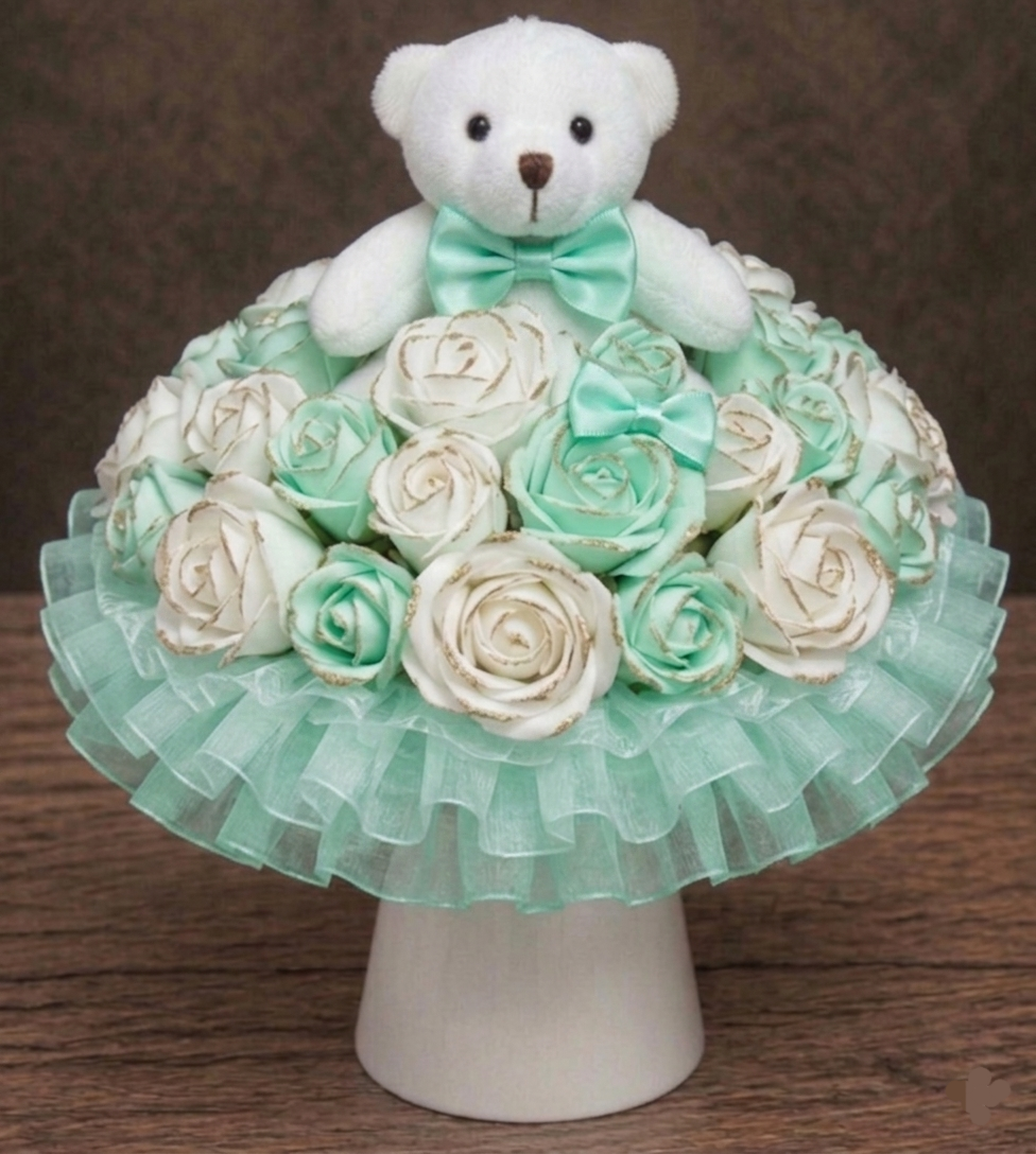 Tento květinový box v sobě nese radost. Je ručně vytvořený z atlasových stuh, které se následně tepelně opracovávají a jemné organzy. Působí živě, ale nikdy nezvadne. Květinový box se skládá z 31 květů, doplněných o čtyři vrstvy organzy ve tvaru bohaté kaskády. Medvídek celému květinovému boxu dává punc roztomilosti. Šířka boxu je přibližně 35 cm, výška 35 cm. Medvídek je vysoký 14 cm. Je to květinový box, který potěší a rozzáří pohled každého. Je ideální jako dárek pro radost, dekorace, nebo symbol osobního okamžiku. JEDINEČNÝ ORIGINÁL.