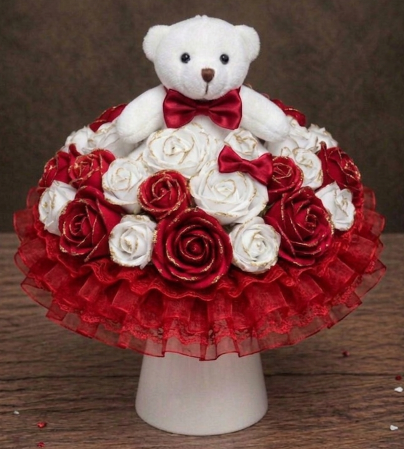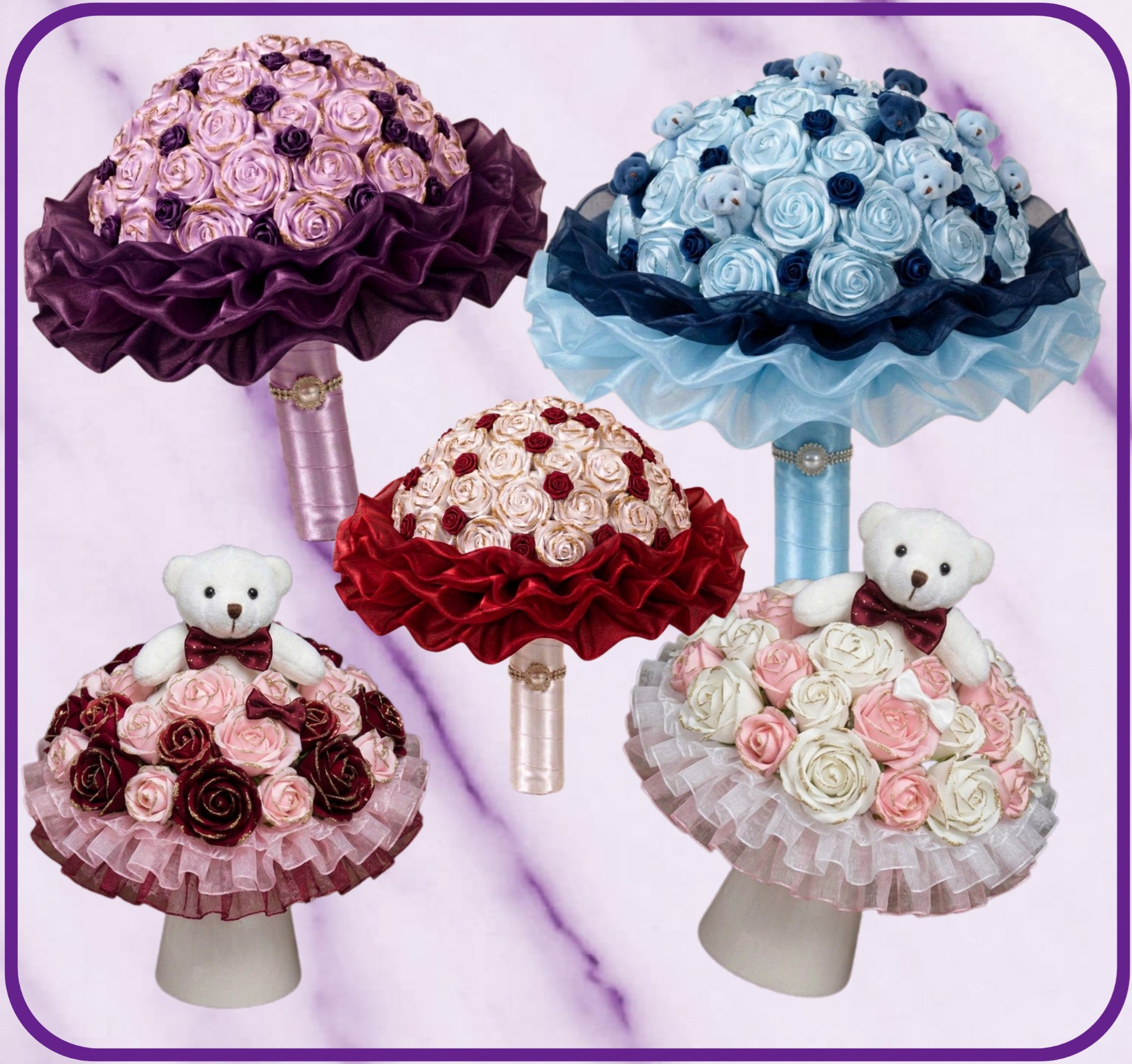 Tento květinový box v sobě nese radost. Je ručně vytvořený z atlasových stuh, které se následně tepelně opracovávají a jemné organzy. Působí živě, ale nikdy nezvadne. Květinový box se skládá z 31 květů, doplněných o čtyři vrstvy organzy ve tvaru bohaté kaskády. Medvídek celému květinovému boxu dává punc roztomilosti. Šířka boxu je přibližně 35 cm, výška 35 cm. Medvídek je vysoký 14 cm. Je to květinový box, který potěší a rozzáří pohled každého. Je ideální jako dárek pro radost, dekorace, nebo symbol osobního okamžiku. JEDINEČNÝ ORIGINÁL.