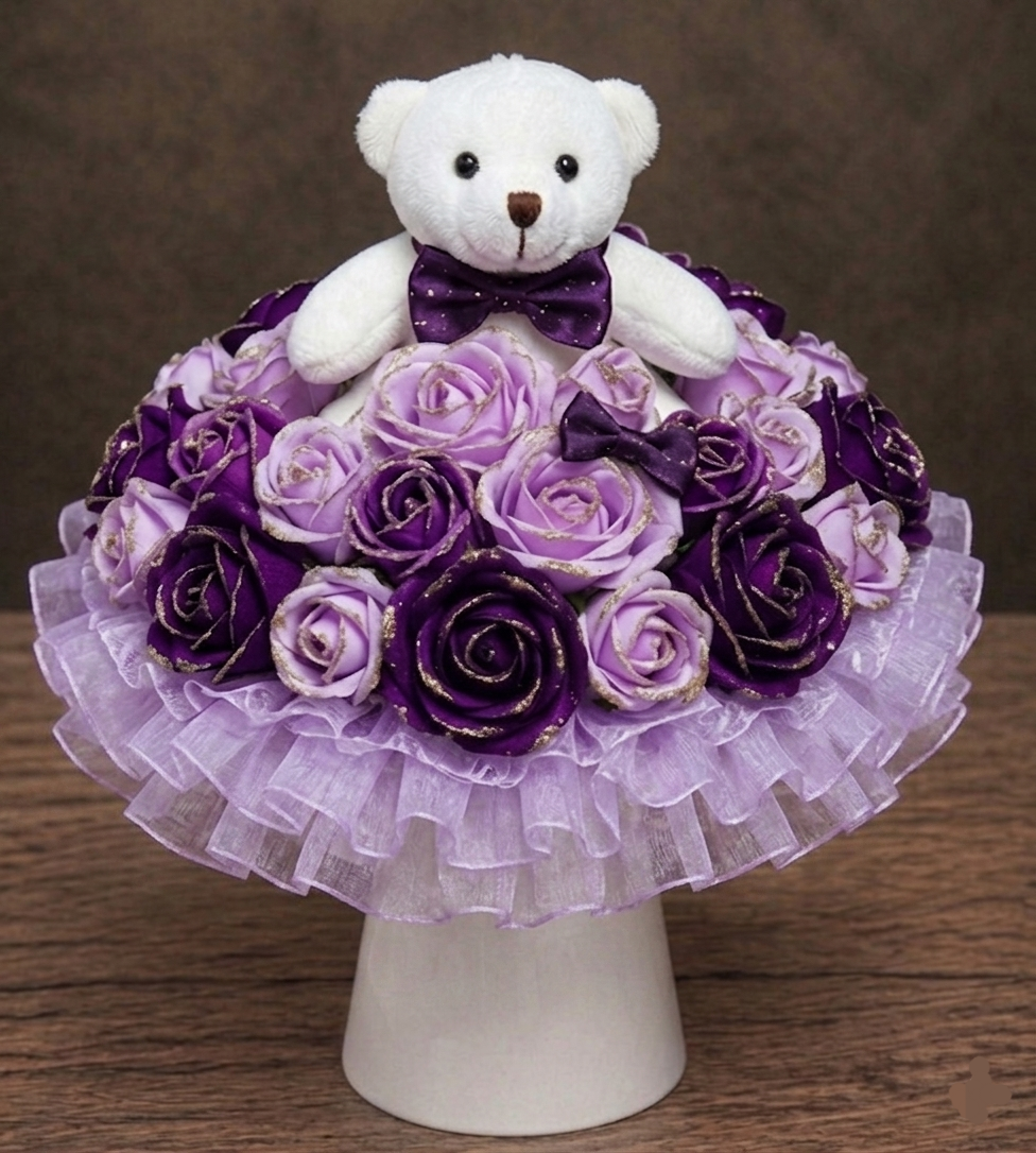 Tento květinový box v sobě nese radost. Je ručně vytvořený z atlasových stuh, které se následně tepelně opracovávají a jemné organzy. Působí živě, ale nikdy nezvadne. Květinový box se skládá z 31 květů, doplněných o čtyři vrstvy organzy ve tvaru bohaté kaskády. Medvídek celému květinovému boxu dává punc roztomilosti. Šířka boxu je přibližně 35 cm, výška 35 cm. Medvídek je vysoký 14 cm. Je to květinový box, který potěší a rozzáří pohled každého. Je ideální jako dárek pro radost, dekorace, nebo symbol osobního okamžiku. JEDINEČNÝ ORIGINÁL.