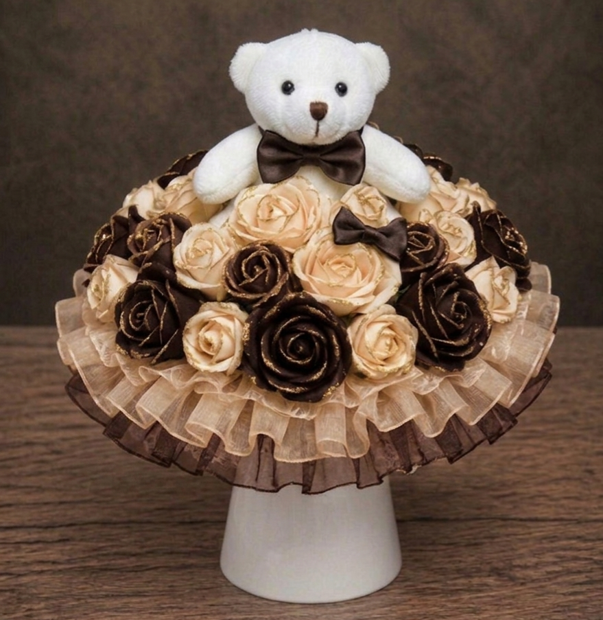 Tento květinový box v sobě nese radost. Je ručně vytvořený z atlasových stuh, které se následně tepelně opracovávají a jemné organzy. Působí živě, ale nikdy nezvadne. Květinový box se skládá z 31 květů, doplněných o čtyři vrstvy organzy ve tvaru bohaté kaskády. Medvídek celému květinovému boxu dává punc roztomilosti. Šířka boxu je přibližně 35 cm, výška 35 cm. Medvídek je vysoký 14 cm. Je to květinový box, který potěší a rozzáří pohled každého. Je ideální jako dárek pro radost, dekorace, nebo symbol osobního okamžiku. JEDINEČNÝ ORIGINÁL.