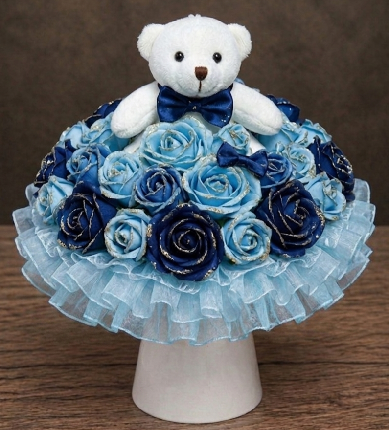 Tento květinový box v sobě nese radost. Je ručně vytvořený z atlasových stuh, které se následně tepelně opracovávají a jemné organzy. Působí živě, ale nikdy nezvadne. Květinový box se skládá z 31 květů, doplněných o čtyři vrstvy organzy ve tvaru bohaté kaskády. Medvídek celému květinovému boxu dává punc roztomilosti. Šířka boxu je přibližně 35 cm, výška 35 cm. Medvídek je vysoký 14 cm. Je to květinový box, který potěší a rozzáří pohled každého. Je ideální jako dárek pro radost, dekorace, nebo symbol osobního okamžiku. JEDINEČNÝ ORIGINÁL.