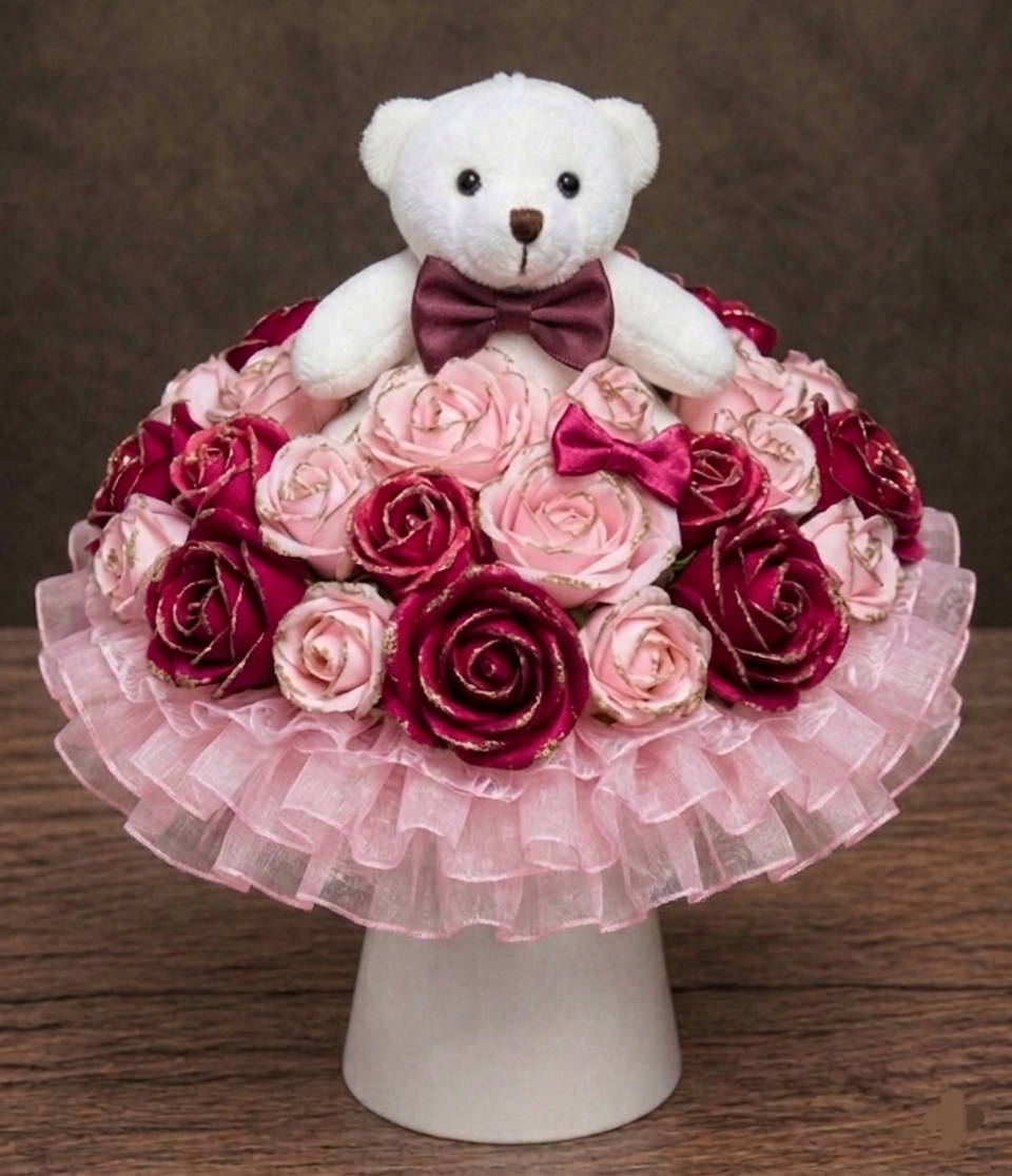Tento květinový box v sobě nese radost. Je ručně vytvořený z atlasových stuh, které se následně tepelně opracovávají a jemné organzy. Působí živě, ale nikdy nezvadne. Květinový box se skládá z 31 květů, doplněných o čtyři vrstvy organzy ve tvaru bohaté kaskády. Medvídek celému květinovému boxu dává punc roztomilosti. Šířka boxu je přibližně 35 cm, výška 35 cm. Medvídek je vysoký 14 cm. Je to květinový box, který potěší a rozzáří pohled každého. Je ideální jako dárek pro radost, dekorace, nebo symbol osobního okamžiku. JEDINEČNÝ ORIGINÁL.