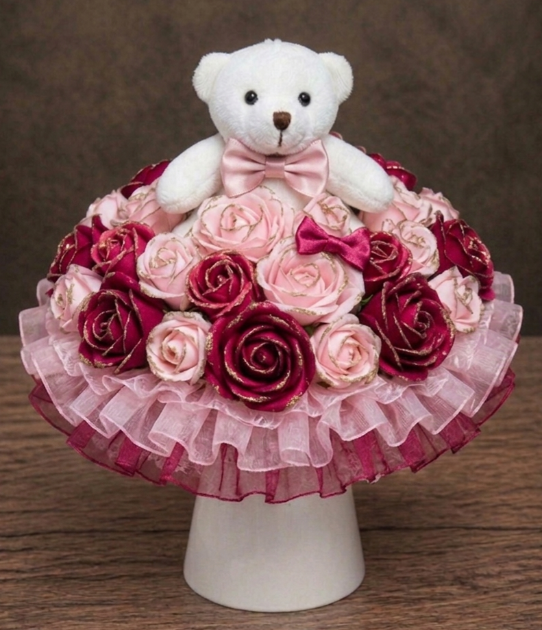Tento květinový box v sobě nese radost. Je ručně vytvořený z atlasových stuh, které se následně tepelně opracovávají a jemné organzy. Působí živě, ale nikdy nezvadne. Květinový box se skládá z 31 květů, doplněných o čtyři vrstvy organzy ve tvaru bohaté kaskády. Medvídek celému květinovému boxu dává punc roztomilosti. Šířka boxu je přibližně 35 cm, výška 35 cm. Medvídek je vysoký 14 cm. Je to květinový box, který potěší a rozzáří pohled každého. Je ideální jako dárek pro radost, dekorace, nebo symbol osobního okamžiku. JEDINEČNÝ ORIGINÁL.