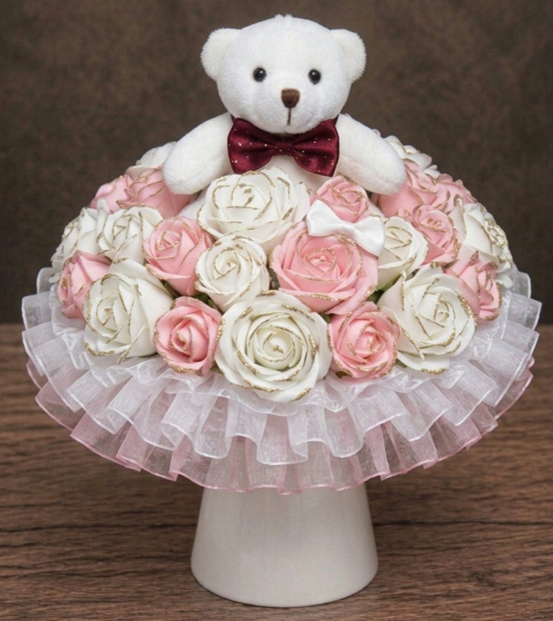 Tento květinový box v sobě nese radost. Je ručně vytvořený z atlasových stuh, které se následně tepelně opracovávají a jemné organzy. Působí živě, ale nikdy nezvadne. Květinový box se skládá z 31 květů, doplněných o čtyři vrstvy organzy ve tvaru bohaté kaskády. Medvídek celému květinovému boxu dává punc roztomilosti. Šířka boxu je přibližně 35 cm, výška 35 cm. Medvídek je vysoký 14 cm. Je to květinový box, který potěší a rozzáří pohled každého. Je ideální jako dárek pro radost, dekorace, nebo symbol osobního okamžiku. JEDINEČNÝ ORIGINÁL.