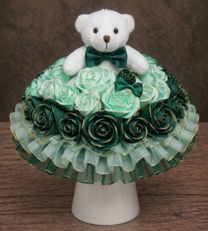 Tento květinový box v sobě nese radost. Je ručně vytvořený z atlasových stuh, které se následně tepelně opracovávají a jemné organzy. Působí živě, ale nikdy nezvadne. Květinový box se skládá z 31 květů, doplněných o čtyři vrstvy organzy ve tvaru bohaté kaskády. Medvídek celému květinovému boxu dává punc roztomilosti. Šířka boxu je přibližně 35 cm, výška 35 cm. Medvídek je vysoký 14 cm. Je to květinový box, který potěší a rozzáří pohled každého. Je ideální jako dárek pro radost, dekorace, nebo symbol osobního okamžiku. JEDINEČNÝ ORIGINÁL.